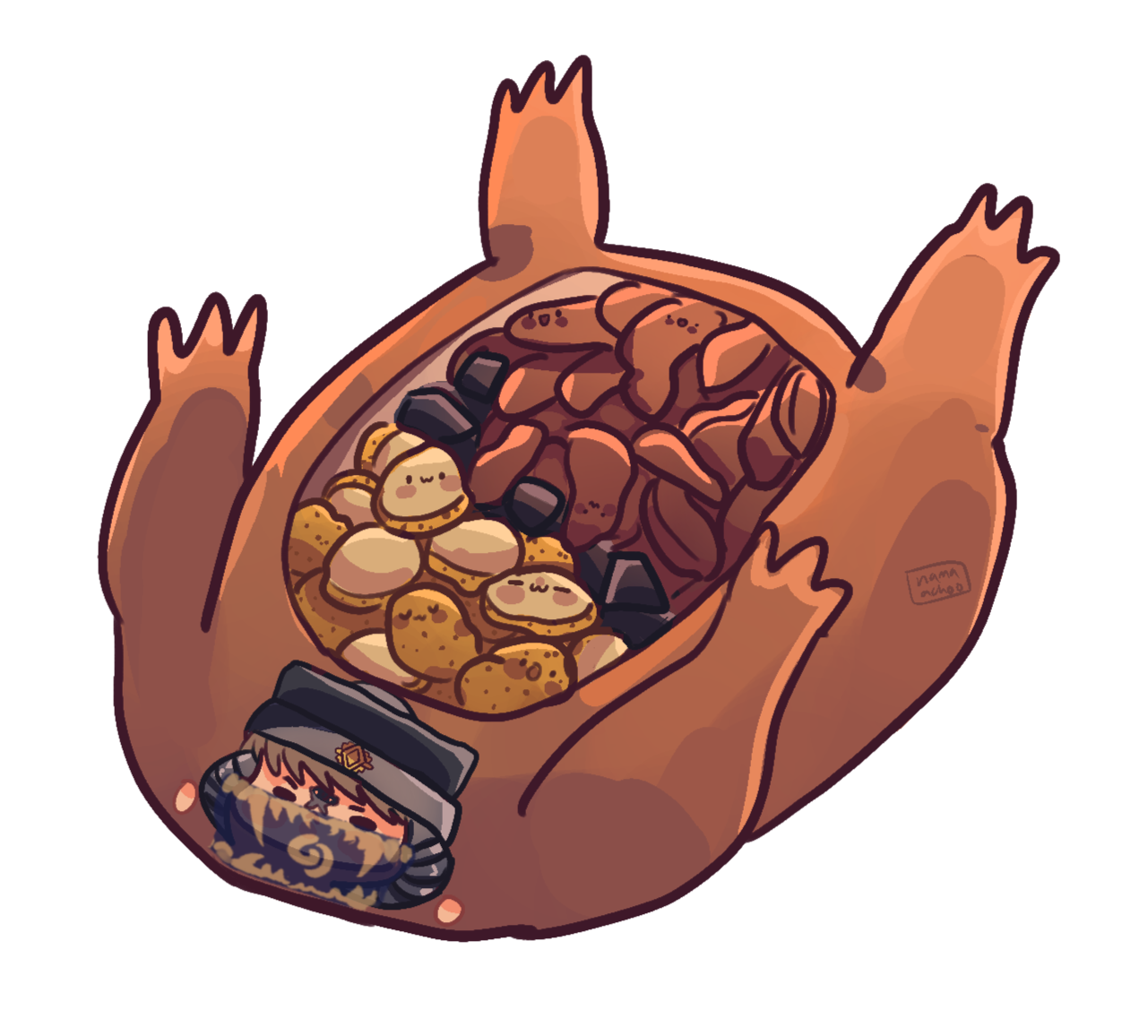 the life of a wanderer is a humble one, bade to rely on the kindness of others to get him through the day. the simple things are earned through labor, or given as provisions from the guild. he's got a proclivity for unfurling his bedroll under a bridge instead of asking friends for a spot on their floor, but if you lend him a bed he'll cook you a meal and fix your wagon wheel after sleeping through the day.